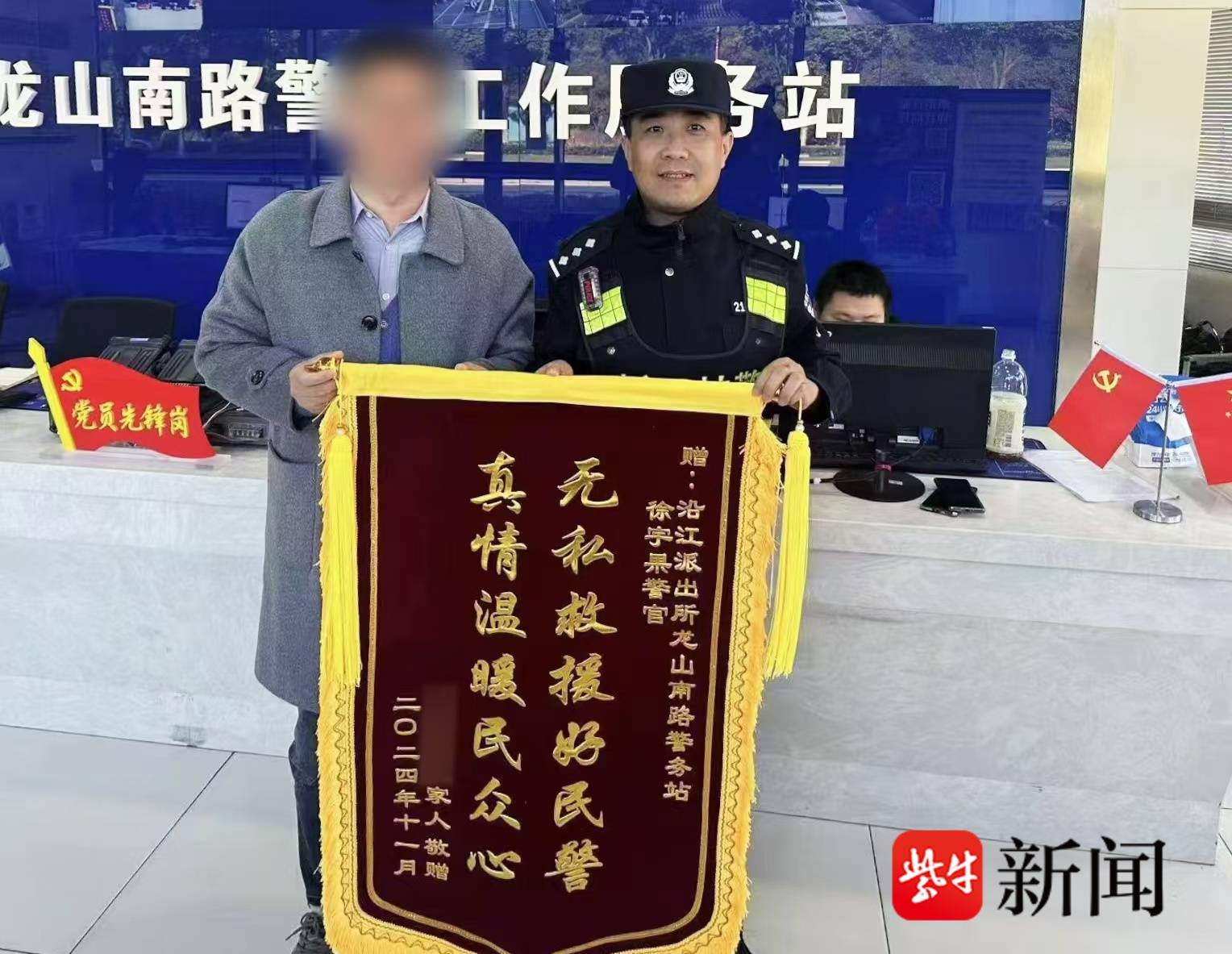 扬子晚报网11月14日讯(通信员 江景轩 记者 梅建明)近日,市民唐先生将一面印有“忘我救助好民警 真情仁爱各人心”的锦旗送到南京市公安局江北新分离局巡特警支队龙山南路警务站,感谢民警匡助找回走失的外婆。